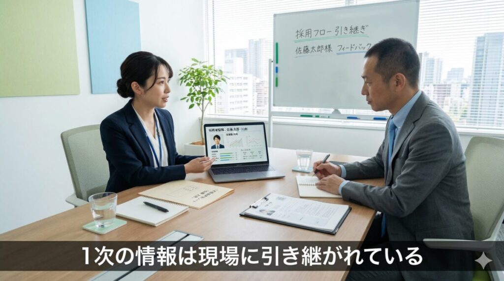 1次面接を担当した人事から、現場の面接官に対して「申し送り情報」が共有されています。具体的には、以下のような内容です。