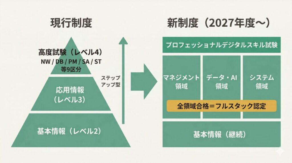 試験区分そのものが大きく再編されます。応用情報と高度試験が統合され、新しい試験体系がスタートします。