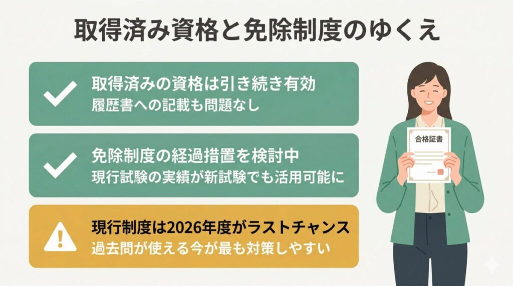 「確実に合格したい」という方には、対策が確立されている現行制度のうちに受験するのが合理的な選択です。 <!– 画像⑥:現行制度と新制度の免除制度対応イメージ –>