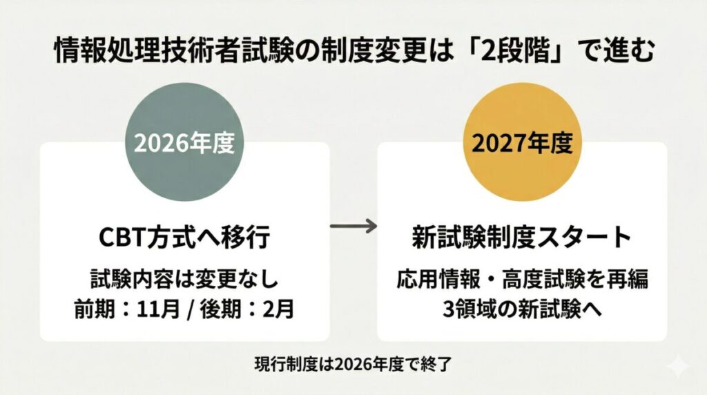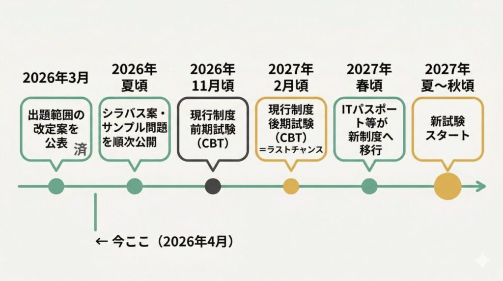 IPAの公式発表によると、現行の試験制度は2026年度の実施をもって終了する予定です。