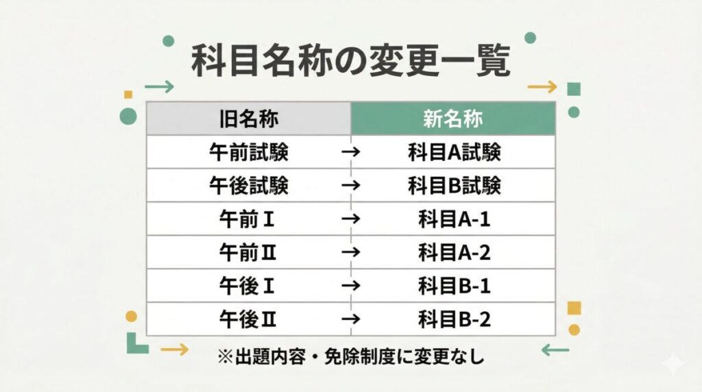 CBT化に伴い、科目名称も変更されます。受験日時を自由に選べるようになるため、「午前」「午後」という時間帯に基づく名称が適さなくなったためです。