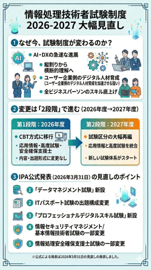 ここまで、2027年度の情報処理技術者試験の大改訂について全体像を解説してきました。