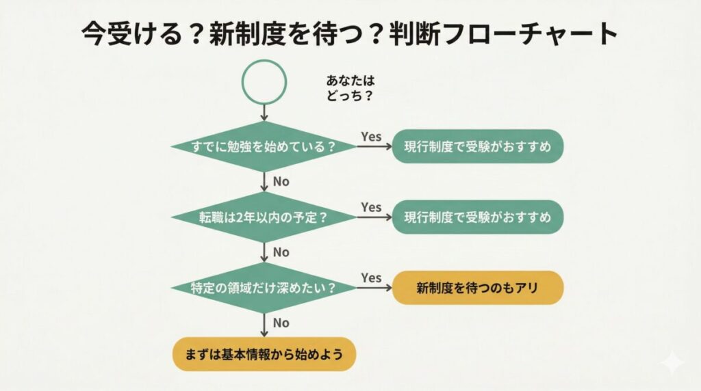 「今受けるべきか、新制度を待つべきか」——これは多くの方が悩んでいるポイントだと思います。人事の立場から、タイプ別に判断基準をお伝えします。