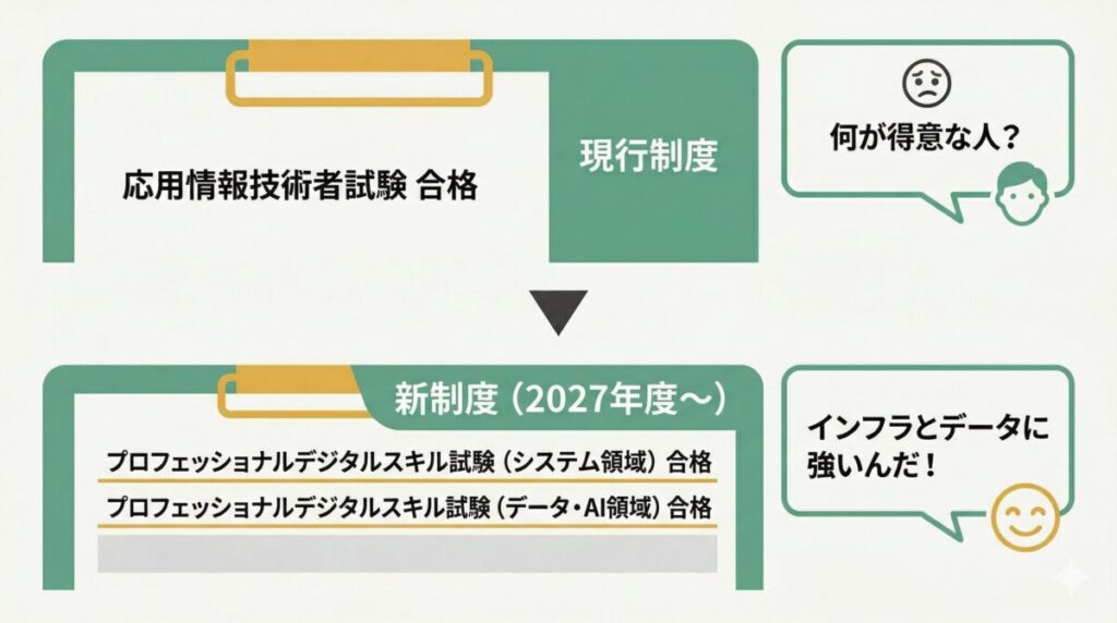 応用情報技術者試験や高度試験に合格している実績は、制度が変わっても引き続き評価されます。