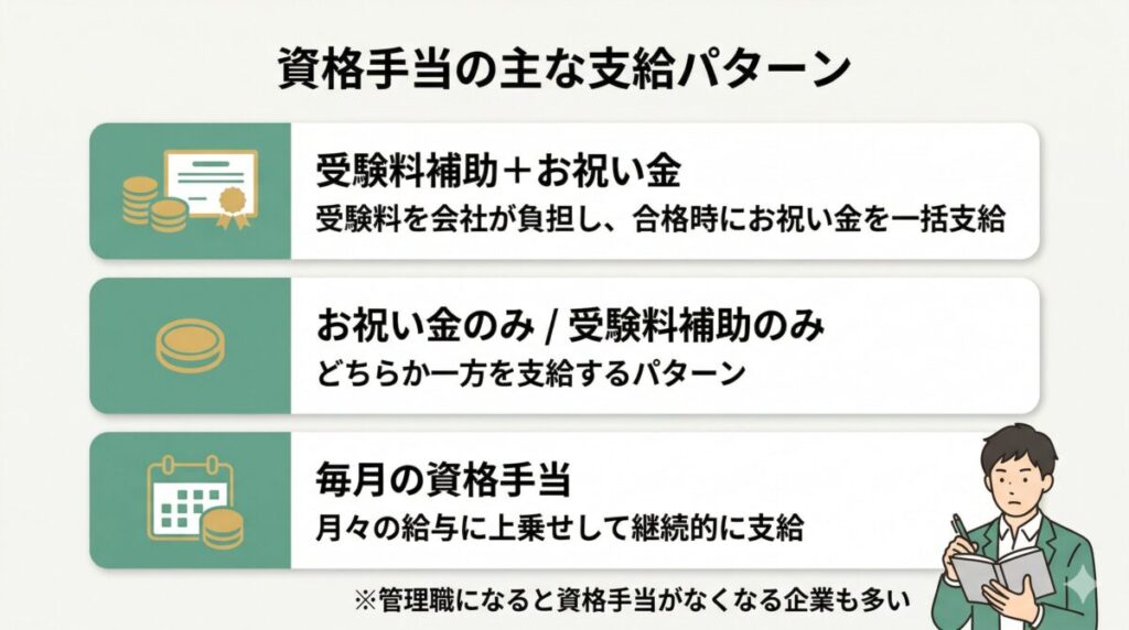 • 受験料補助+お祝い金:受験料を会社が負担し、合格時にお祝い金を一括支給