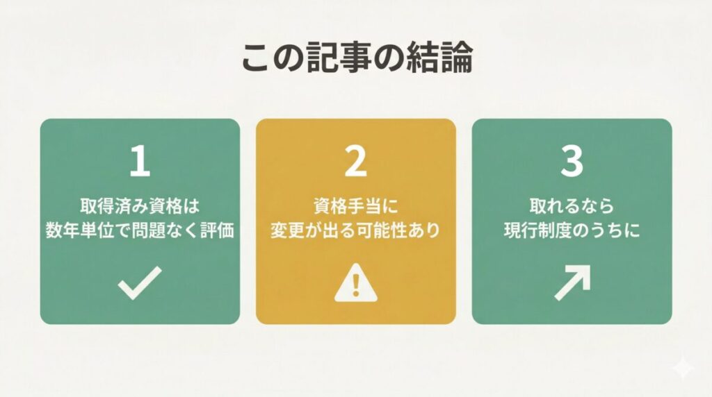 制度改訂をきっかけに、資格手当の金額そのものが見直される可能性もあります。