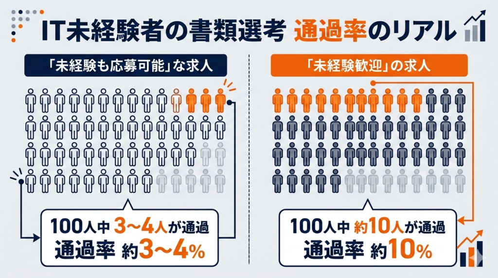 - IT未経験者の書類通過率は「未経験歓迎」の求人でも100人中10人程度。厳しいからこそ、書類の質で差がつく