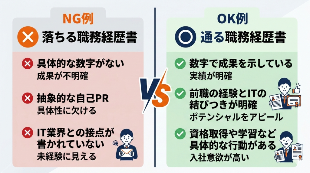 前職の経験をそのまま書くだけでは、「この人はIT業界で何ができるんだろう?」という疑問が解消されません。前職の経験とIT業界の仕事を自分なりに結びつけて言語化できているかどうかが、通過する人としない人の分かれ目です。