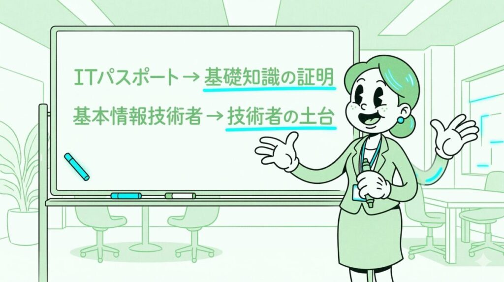 理由は、ITパスポート → 基本情報と段階的に継続性やスキルアップしている姿勢が伝わるからです。