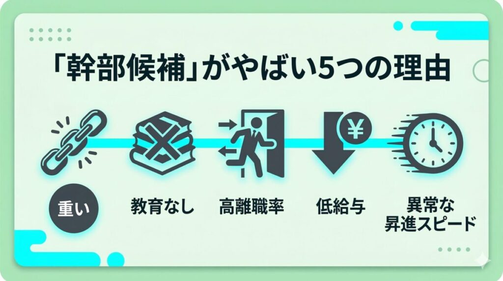 ここからは、「幹部候補」と書かれた求人が具体的にどう危険なのか、5つの理由を詳しく解説します。