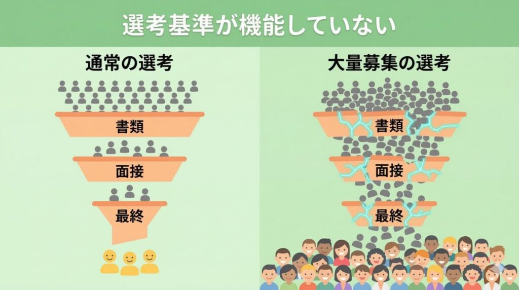 「大量募集」という言葉の裏には、本来あるべき選考基準が機能していないという問題があります。
