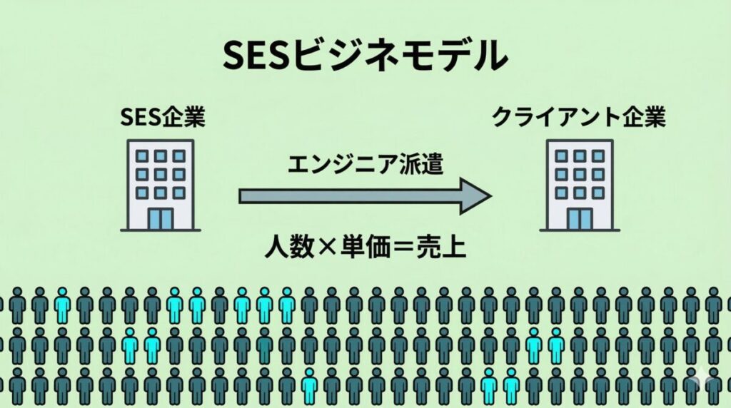 SESとは、簡単に言えば「エンジニアをクライアント企業に常駐させて、その対価を受け取る」ビジネスです。つまり、人を一人送り込めば、その分だけ売上が増える構造になっています。