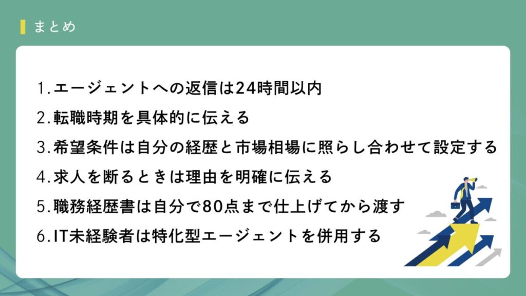 - 自分の属性(経験者/未経験者、年齢層、希望業界)に合ったエージェントを選ぶ