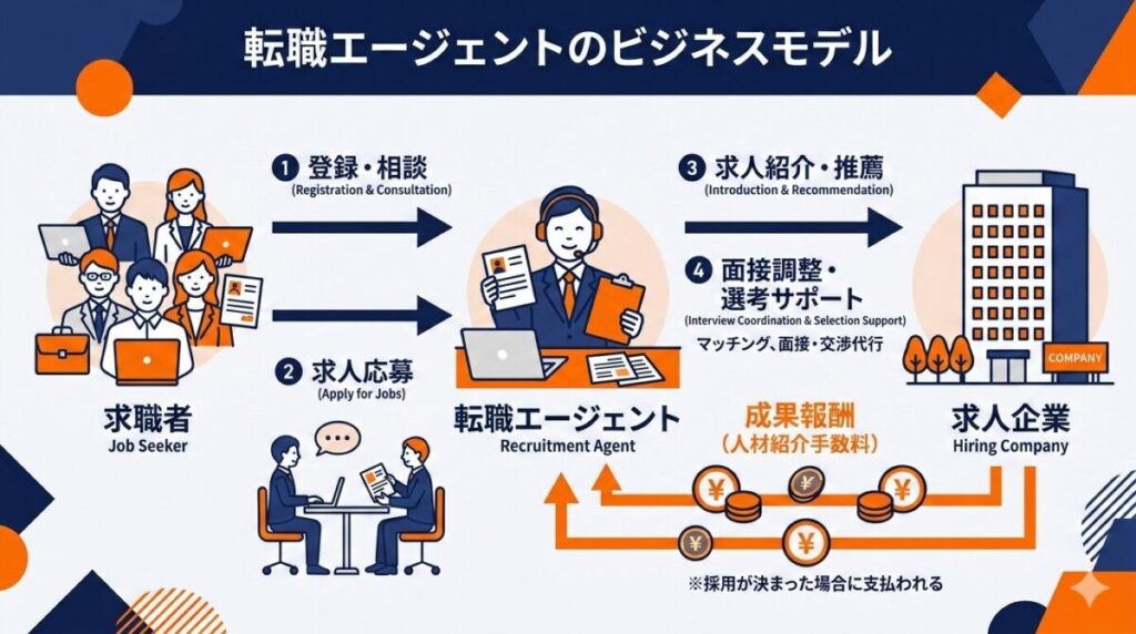 エージェントの収益は、求職者が企業に入社したときに企業から支払われる成功報酬で成り立っています。
