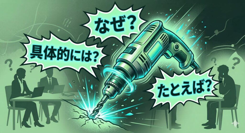 面接官はあなたの発言すべてに「なぜ?」「具体的には?」「たとえば?」の3つのドリルを突き刺してきます。