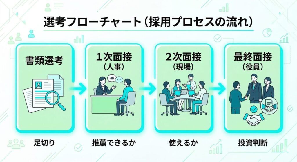 面接で何を聞かれるかばかり気にしていませんか?企業の選考フローには、各段階ごとに明確なふるい落としの基準が設計されています。ここを知っているかどうかで、企業研究の使い方がまったく変わります。