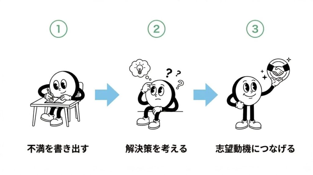 この流れが作れると、退職理由と志望動機に一貫性が生まれます。面接官が一番納得しやすいのは、この「不満 → 解決策 → 御社ならできる」の流れです。