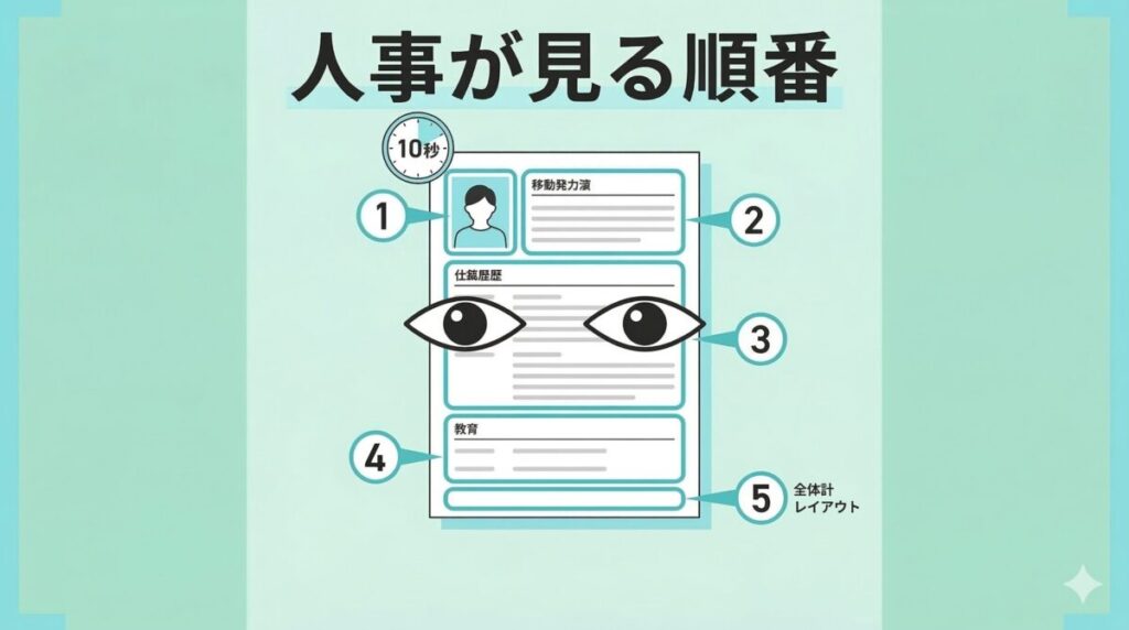 ここでは、採用担当者が実際にどんな順序で、どのくらいの時間をかけて書類を見ているのかをお伝えします。